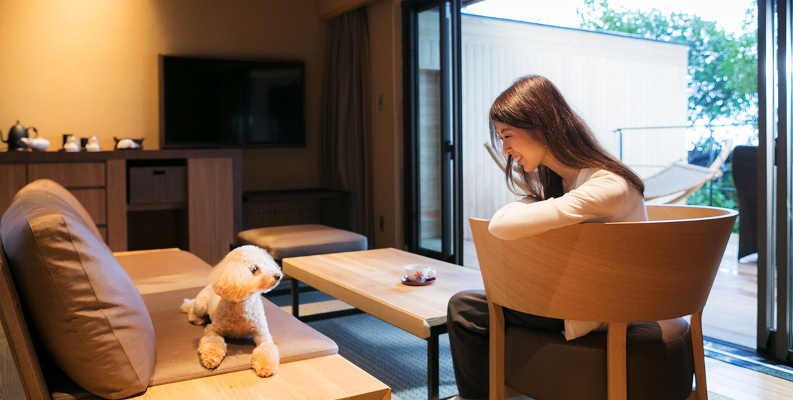 気兼ねなくお過ごしいただけるようテラスにはお客様専有の露天風呂を備え、愛犬との旅に便利なワンちゃん用アメニティもご用意しています。